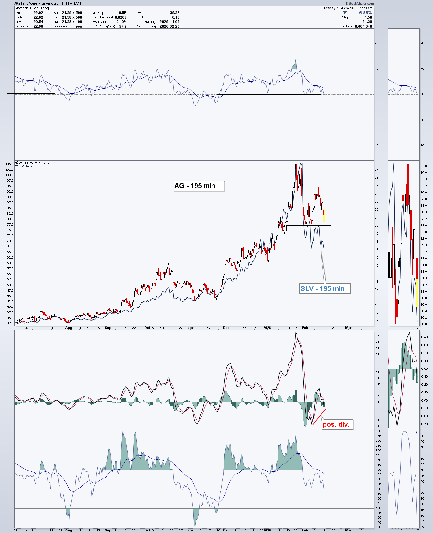 Questa la chart che avevo pubblicato = AG quotava 21,38$ ed era evidenziata chiaramente la divergenza positiva sull'indicatore inferiore