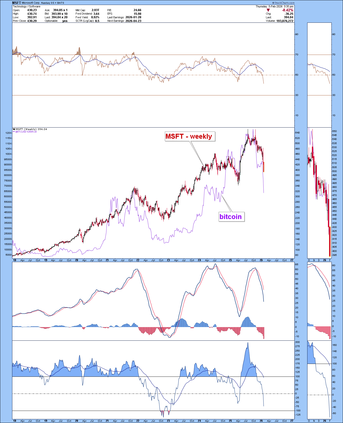 Oggi MSFT fa -5% e la correlazione che pochi vedono con il Bitcoin indica che cio' che spinge entrambi è la stessa mano. Possiamo anche dire che il Bitcoin anticipa MSFT e una sua continua caduta non sarà un bel segnale per MSFT.