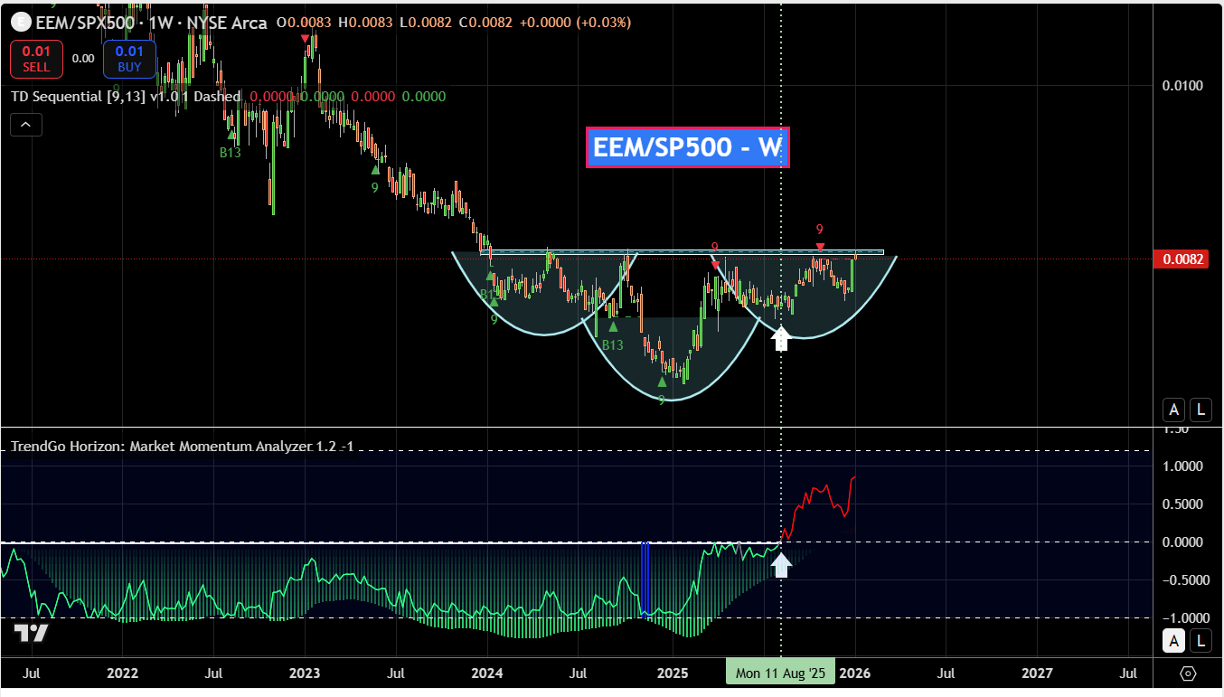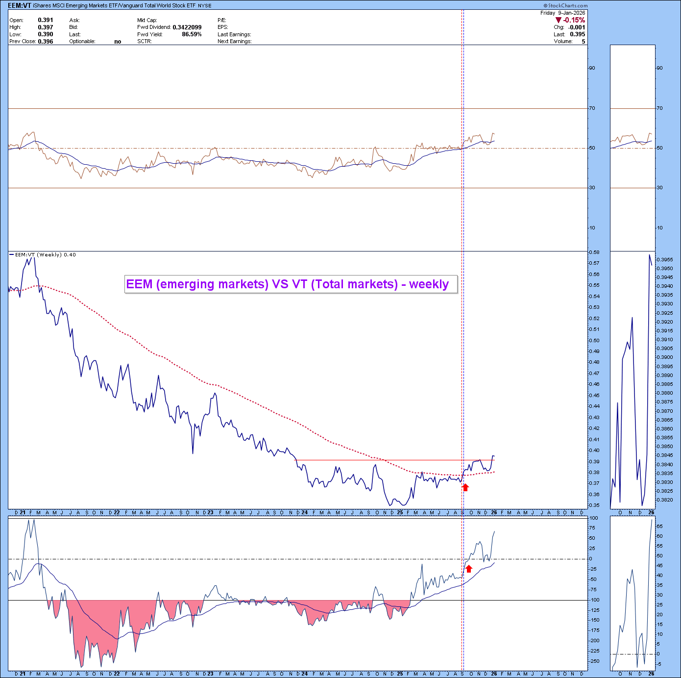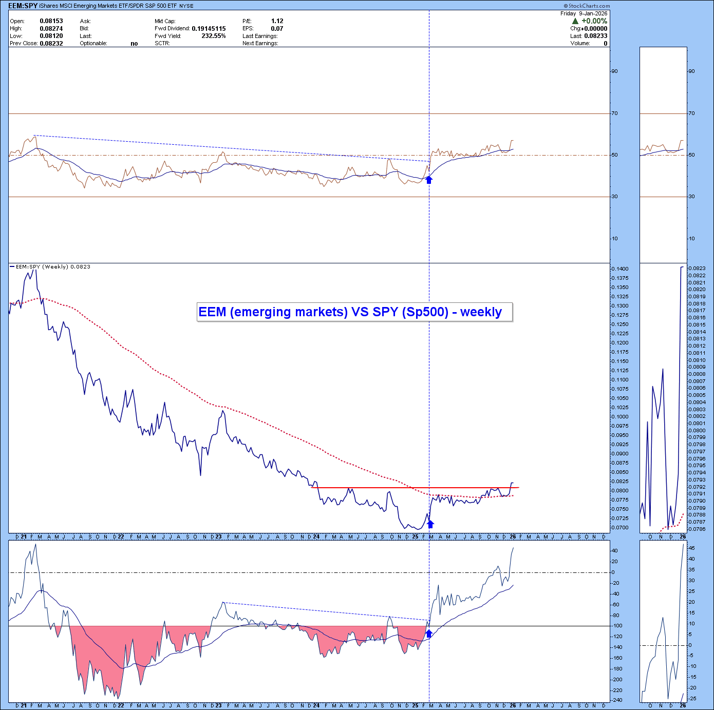 - 1) EEM / VT = emerging markets Vs Total market = lunga accumulazione (testa e spalle rialzista) con segnali di breakout al rialzo a favore degli EEM