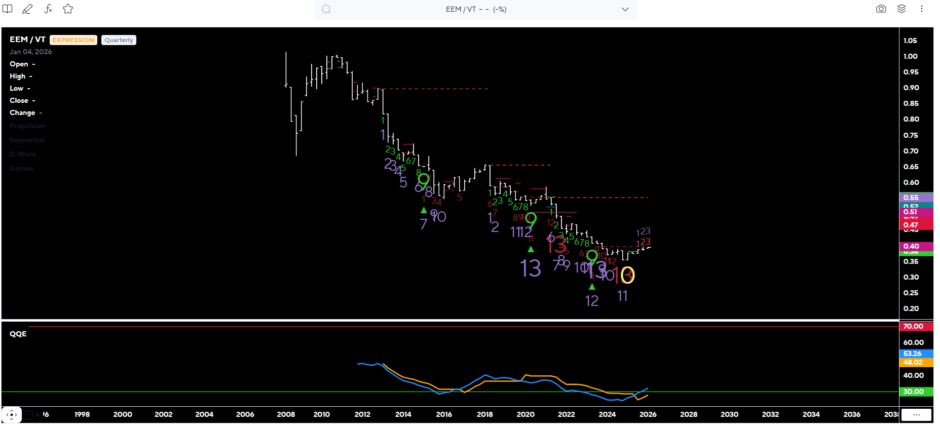 - 3) CHART TRIMESTRALE EEM/VT = per chi non è abituato alla strategia di DeMark quando ci sono dei "13" su charts TRIMESTRALI significa che il trend che inverte ha un significato GENERAZIONALE quindi di lunghissimo periodo!