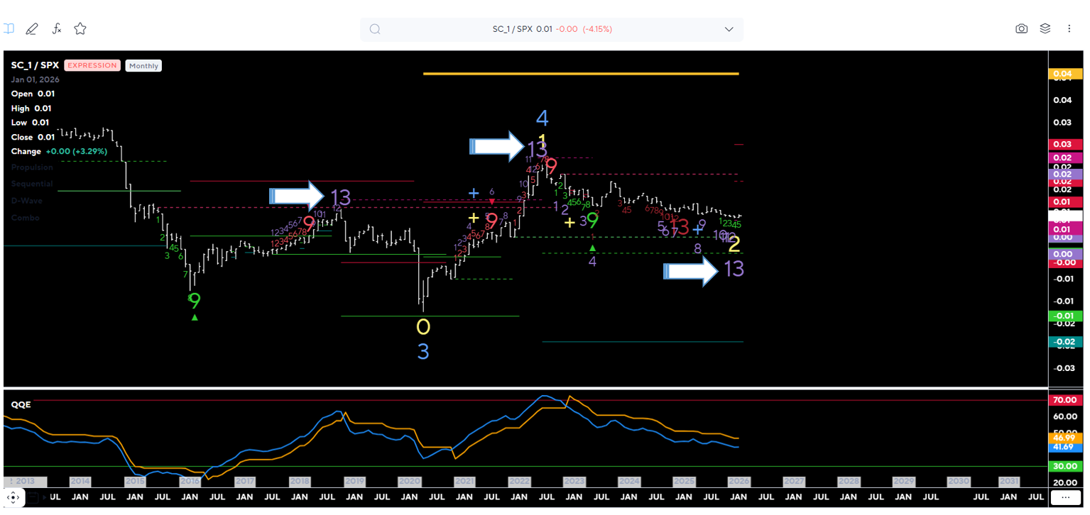 Questa è una chart con la strategia di DeMark (mensile): il "13" - lo sanno coloro che sono ABBONATI - è un segnale importantissimo se lo vedi su charts mensili: basta osservare dove lo trovi in passato (prima di importanti inversioni)