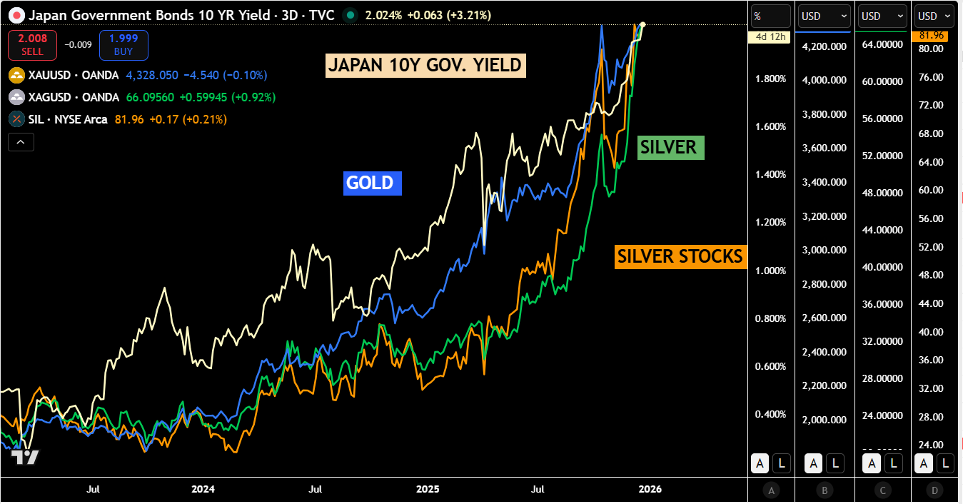 - OSSERVANDO QUESTA CHART SI VEDE LA CORRELAZIONE FORTE TRA YIELDS 10Y GIAPPONESI, GOLD, SILVER E SILVER STOCKS.