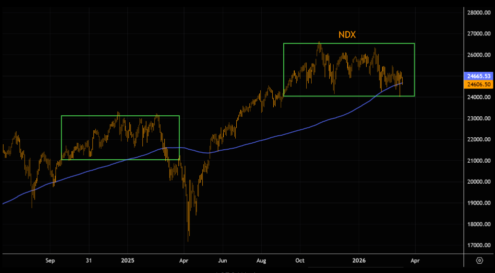 Il NASDAQ è sostanzialmente uno specchio del grafico dell'SPX, avvicinandosi alla media mobile a 200 giorni. Il limite inferiore del range si attesta leggermente più in basso, intorno ai 24.000 dollari (future).