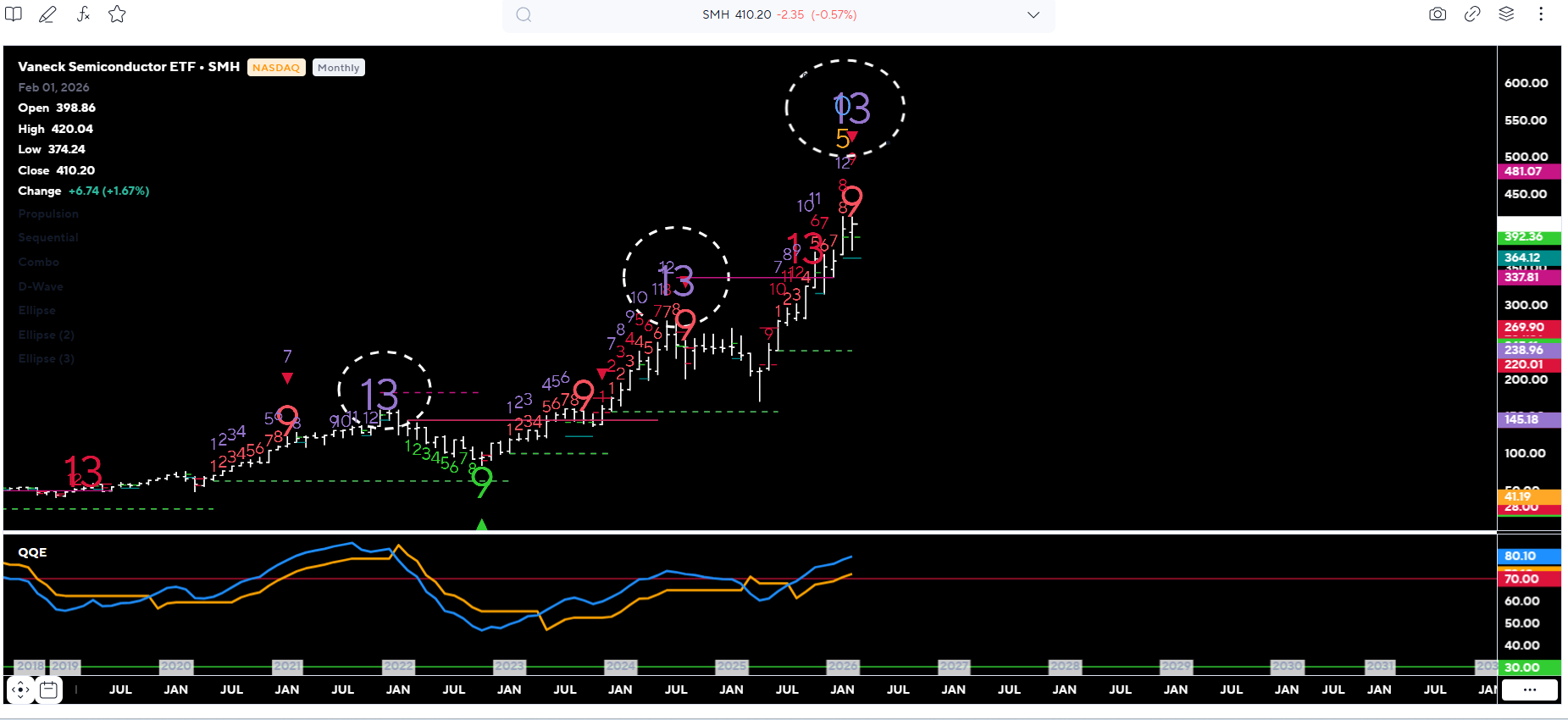 CHE COINCIDA ANCHE CON LA STRATEGIA DI DEMARK - PER ESEMPIO SUI SEMICONDUTTORI NELLA CHART MENSILE - CHE VEDE UN TOP NEL 2026 DI QUESTO SETTORE? (quando c'è un COMBO SELL 13 - come in passato - il segnale è sempre stato di SELL)