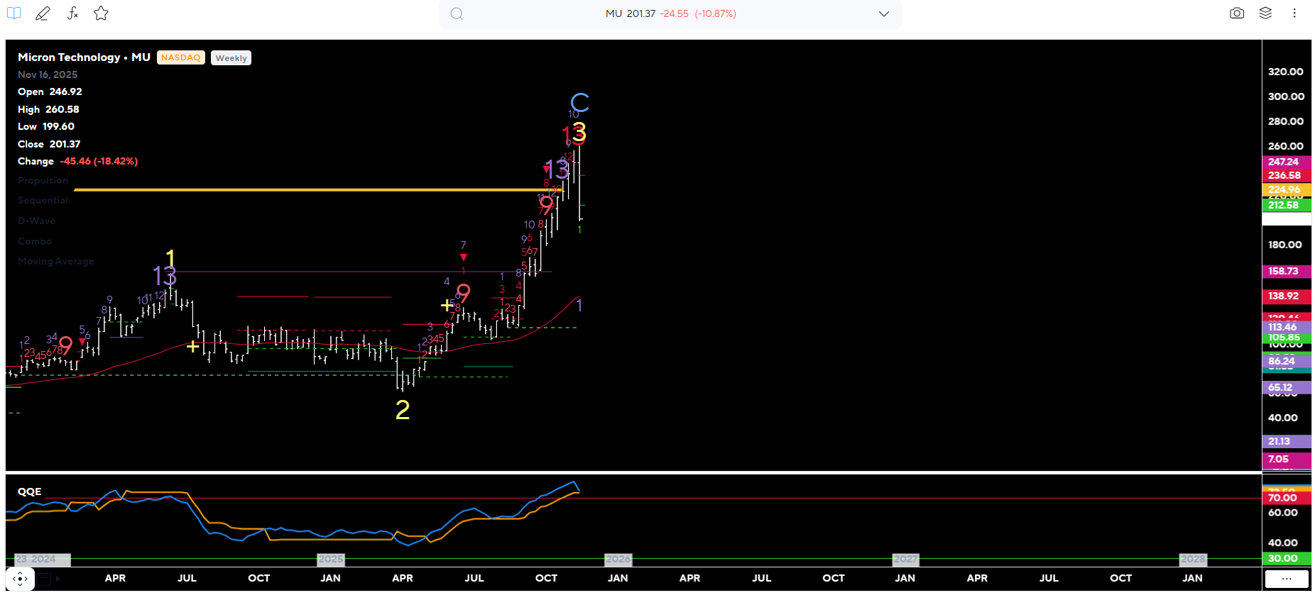 weekly chart per DeMark per MU = Sell Sequential 13 & Sell Combo 13 sulla 3^ onda....