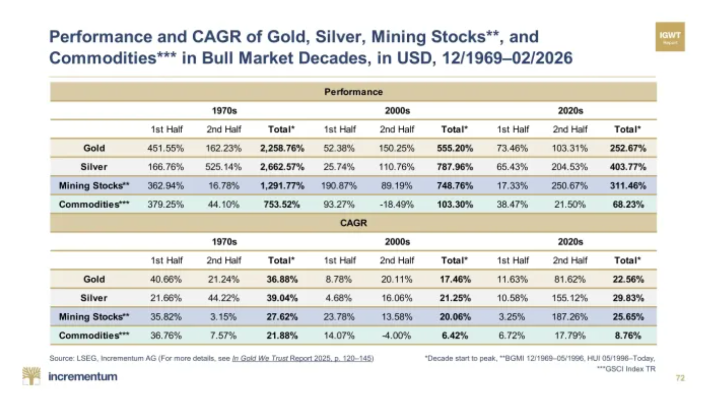 - Questa tabella di Incrementum ci dà la prova storica: i mercati rialzisti degli anni '20 sono già iniziati, sono potentissimi e, storicamente, il meglio deve ancora venire.
