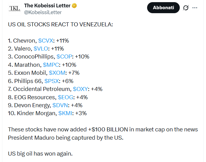 Come vedi ci sono quelle segnalate prima dell'arresto di Maduro: XOM, CVX, MPC, VLO, DVN, ....