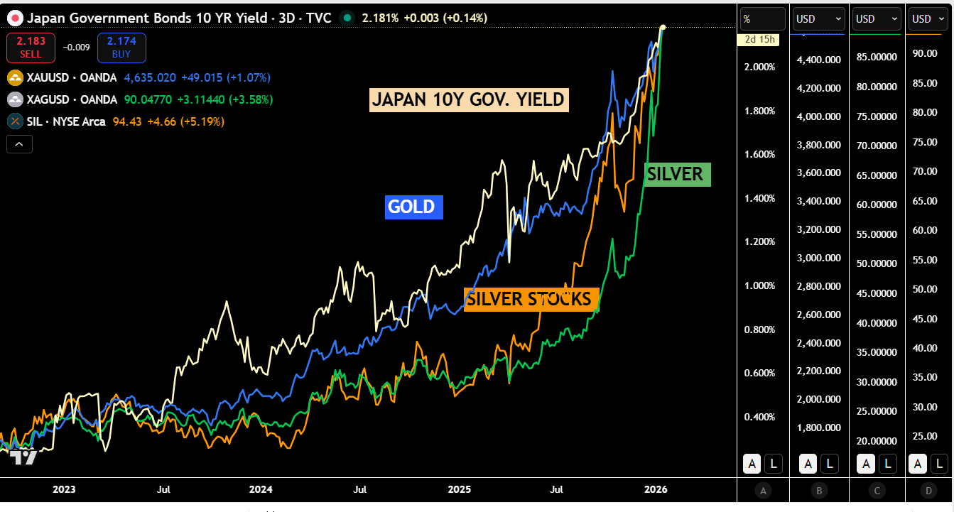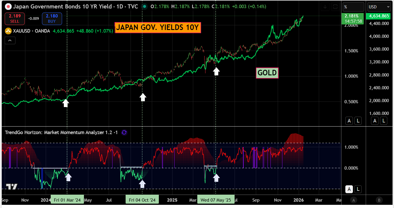 La correlazione è evidente: quando la mattina ti svegli guarda come vanno i tassi giapponesi a 10Y e scoprirai come stanno performando i metalli preziosi.
