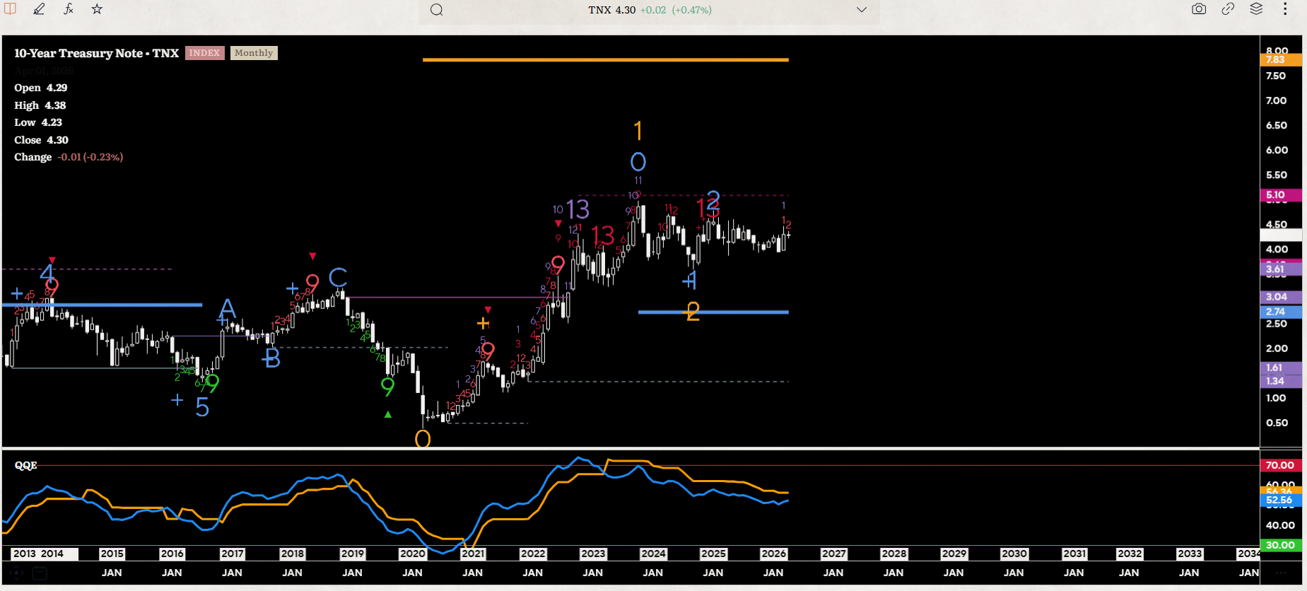 DeMark indica che lo scenario rialzista dei tassi a 10Y U.S.A. potrebbe vederli in area 7,5% addirittura (chart mensile)