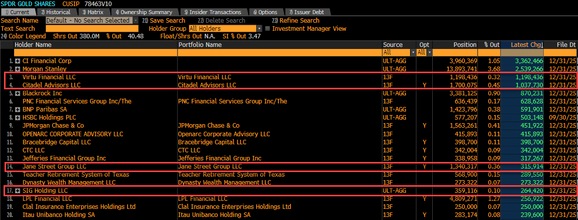 I dati riportano la data del 31/12/2025. Questo indica che i grandi "arbitraggisti" di Wall Street hanno passato l'ultimo trimestre dell'anno scorso a posizionarsi pesantemente sull'oro in previsione delle turbolenze che stiamo vedendo ora nel febbraio 2026.
