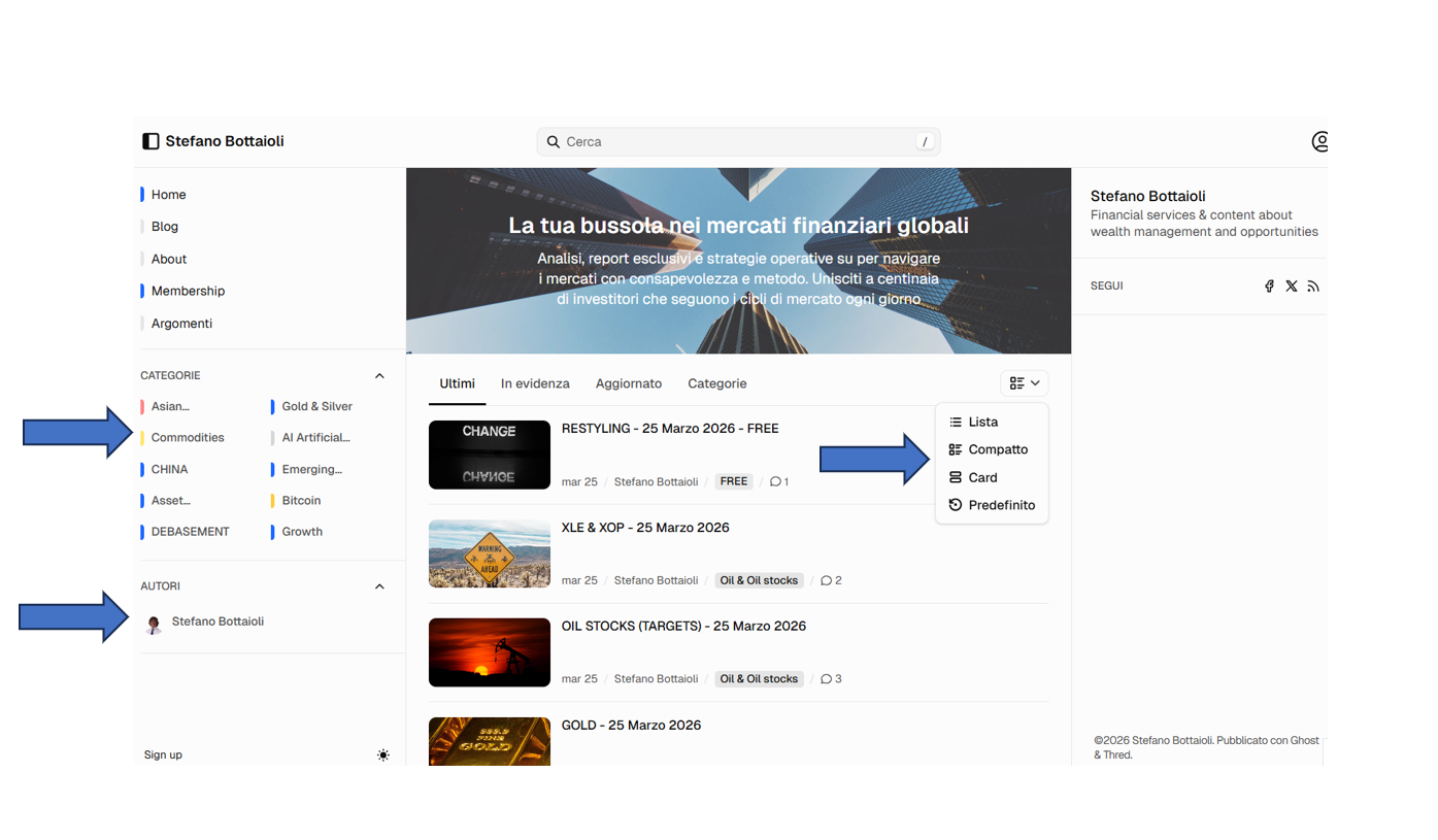 - 1) CATEGORIE = gli articoli sono raggruppati per categoria di appartenenza (a volte trovi l'articolo anche in piu' categorie nei casi in cui riguardi piu' argomenti). CLICCANDO su ARGOMENTI sia pre una schermata con tutte le categorie in ordine decrescente di pubblicazione (esempio: Cliccando su Gold & Silver si apriraà l'elenco di tutti gli articoli in questa categoria in ordine cronologico decrescente)