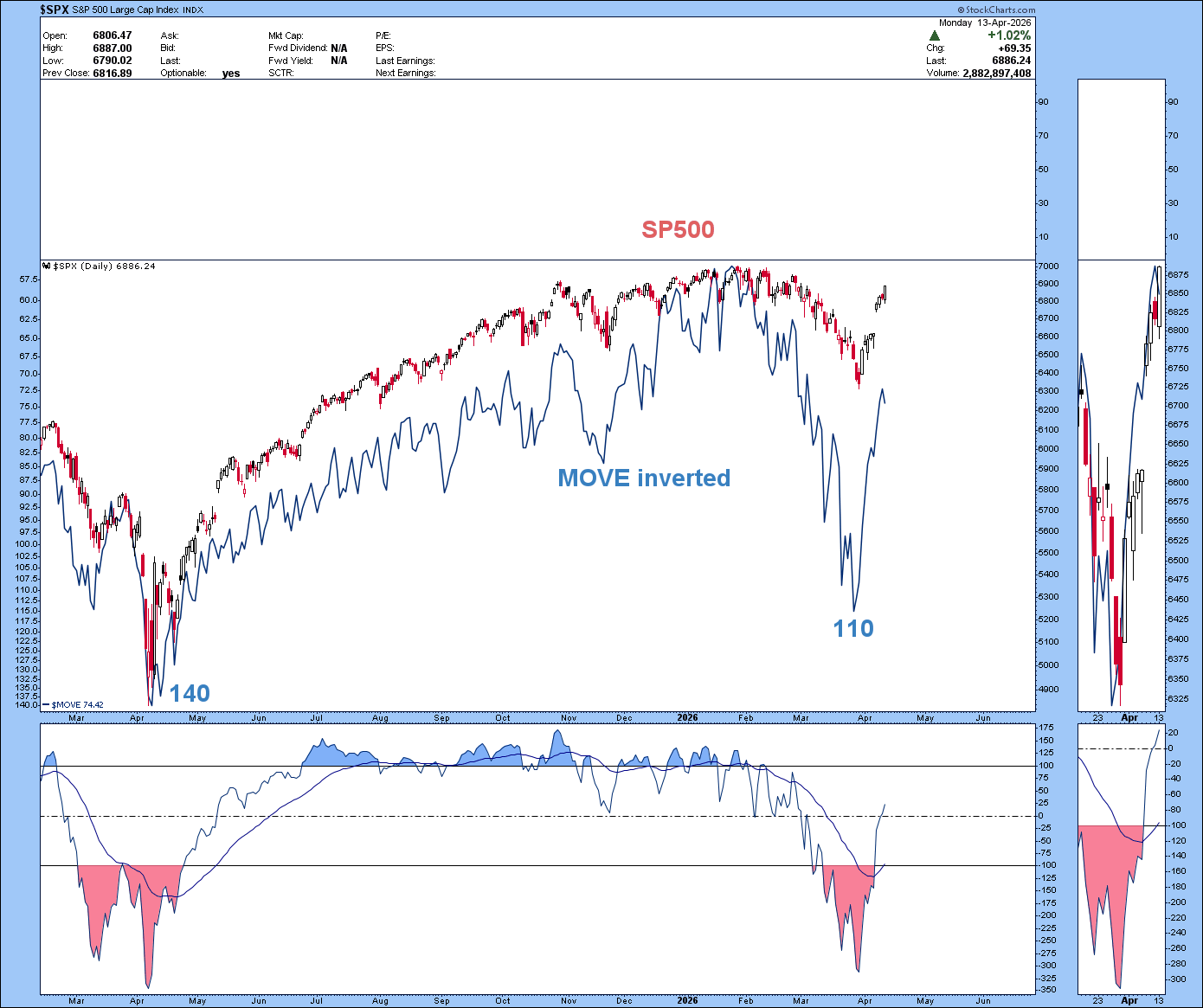 Il grafico evidenzia due momenti in cui il MOVE (invertito) è crollato drasticamente (ovvero la volatilità dei bond è esplosa):