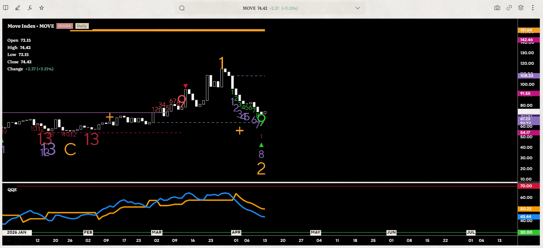 - Significato: Nel sistema di DeMark, un "9" indica spesso un punto di esaurimento del trend. In questo caso, suggerisce che la recente discesa della volatilità (il calo del MOVE da area 110 a 74) potrebbe essere finita.