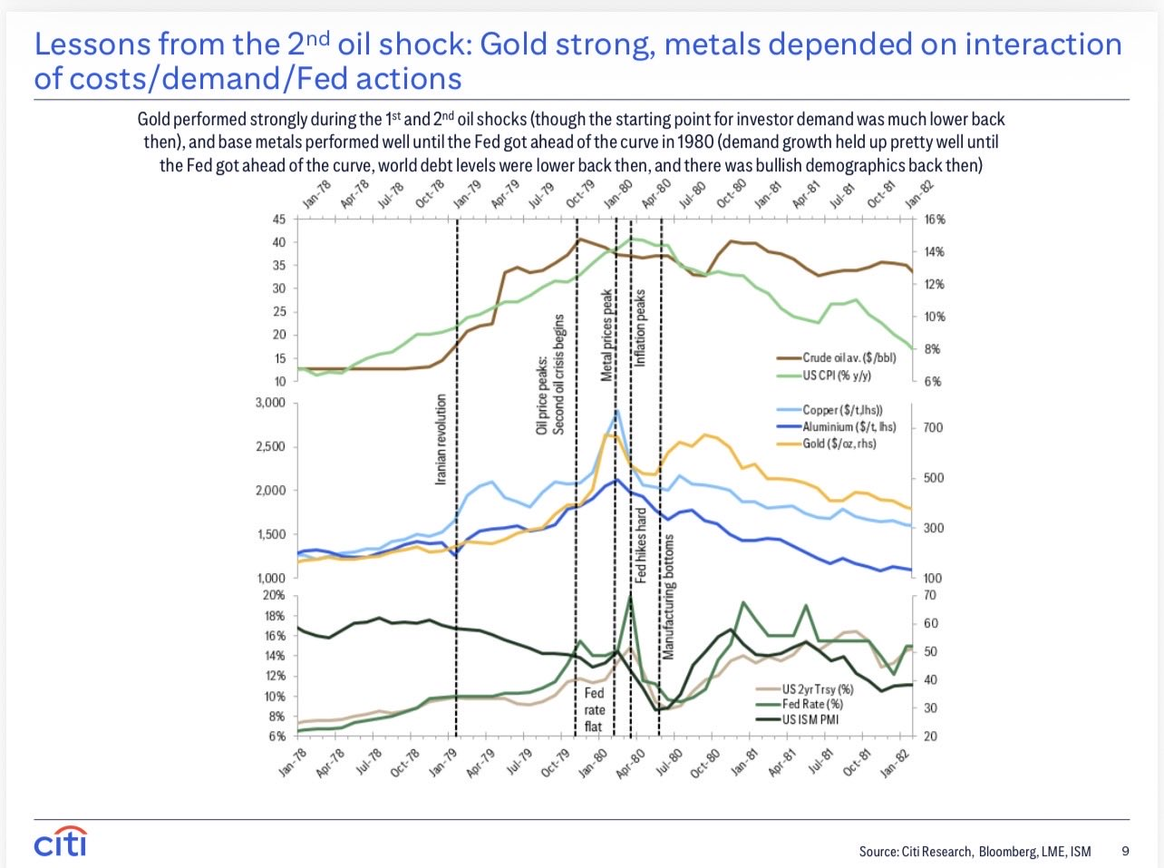 Questa seconda immagine è fondamentale perché serve a Citi per dire: "Guardate che è già successo in passato, ecco cosa abbiamo imparato". Analizza il secondo shock petrolifero (quello del 1979-1980 legato alla rivoluzione iraniana) per cercare di capire cosa accadrà oggi.