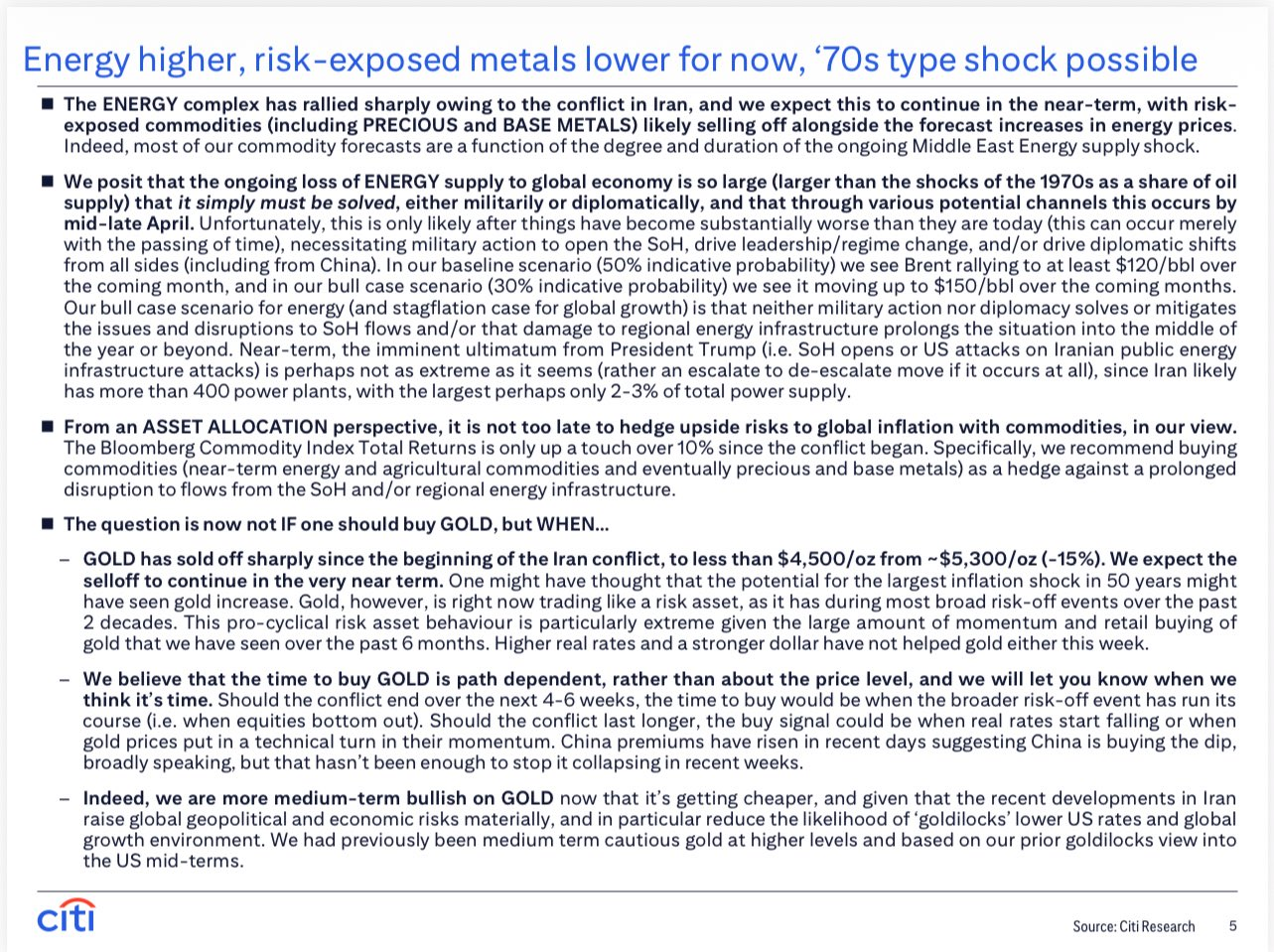 Il succo della questione è che il conflitto in Iran sta incasinando il mercato delle materie prime. L'energia (petrolio) sta volando, mentre i metalli (oro incluso) stanno soffrendo. Citi dice che potremmo essere di fronte a uno shock simile a quello degli anni '70.